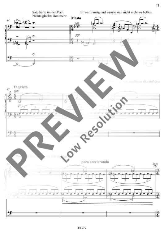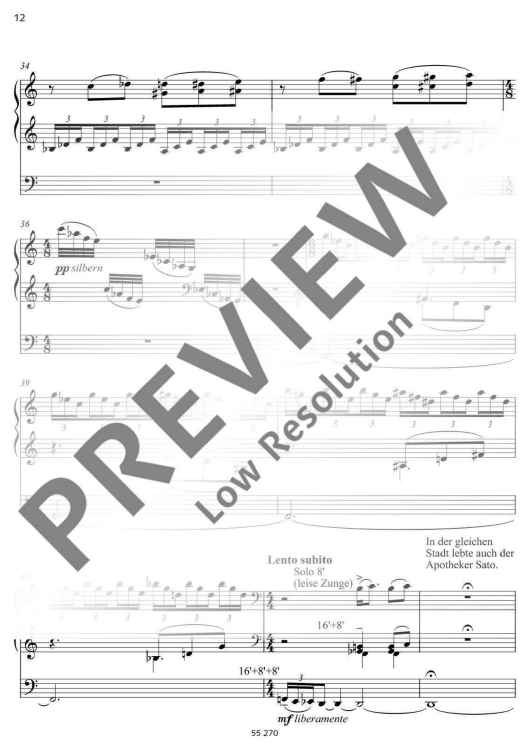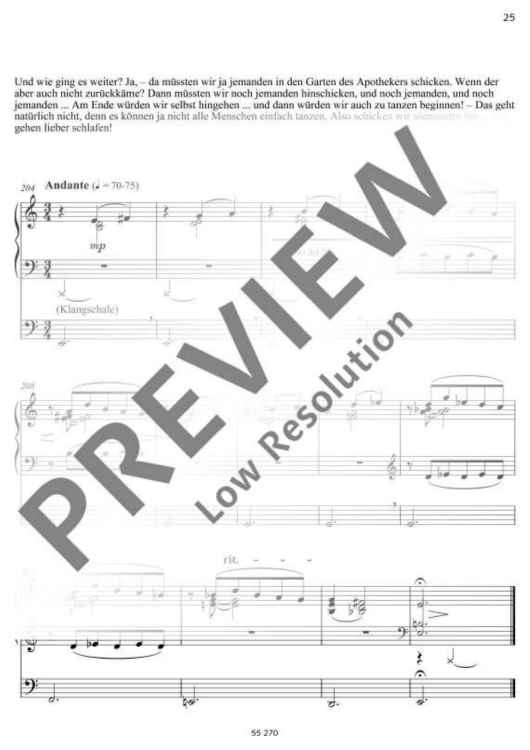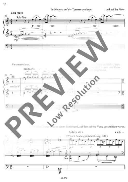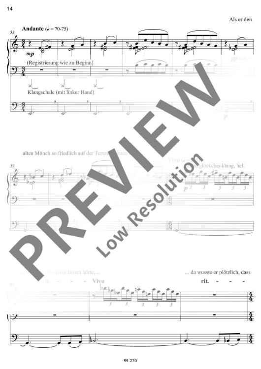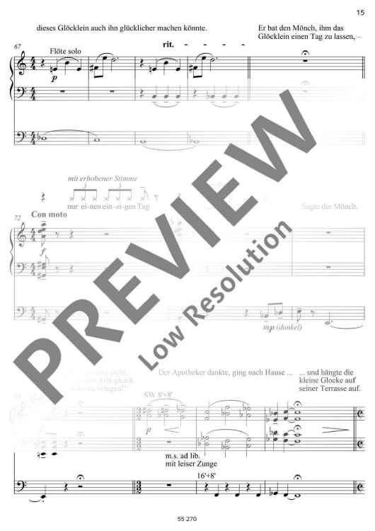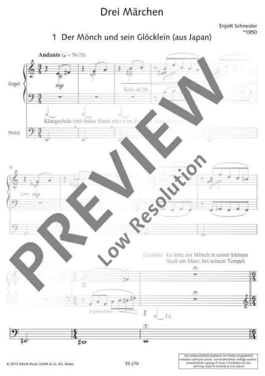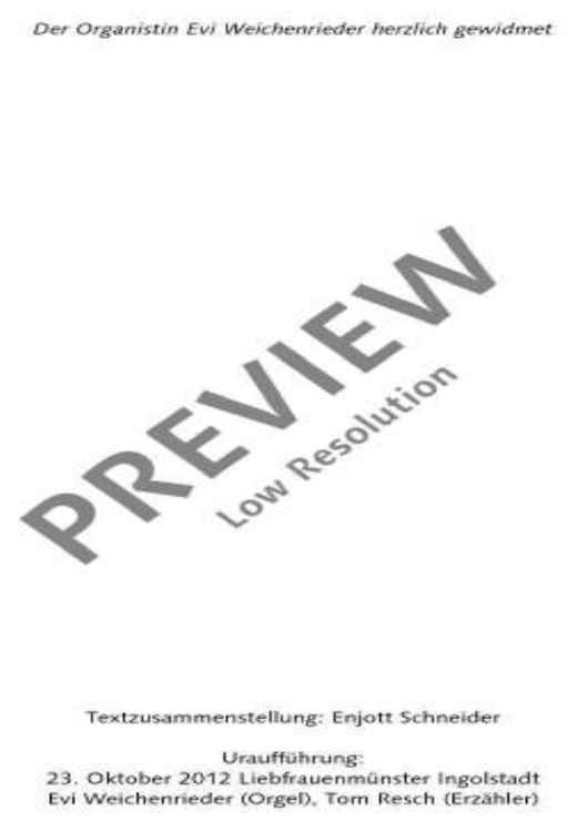 Three fairy-tales based on traditional texts, arranged as a melodrama by Enjott Schneider. The fairy-tales require a gripping narrator and an imaginative organist who finds colourful and gentle sounds that are dramaturgically suitable, depending on the specification of the organ. A valuable addition to the repertoire for organ concerts, organ inaugurations or children's and youth concerts.