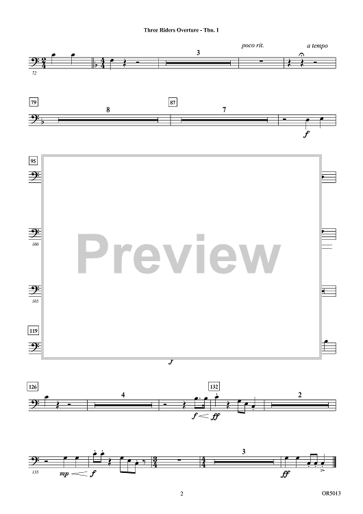 Digital Sheet Music for Three Riders Overture - Trombone 1 by Carrie Lane Gruselle scored for Orchestra; id:506642
