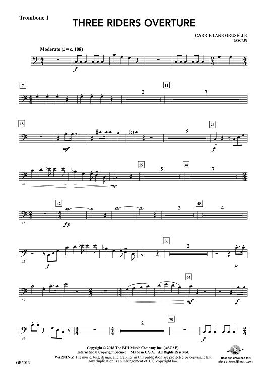 "Three Riders Overture - Trombone 1" Sheet Music by Carrie Lane Gruselle