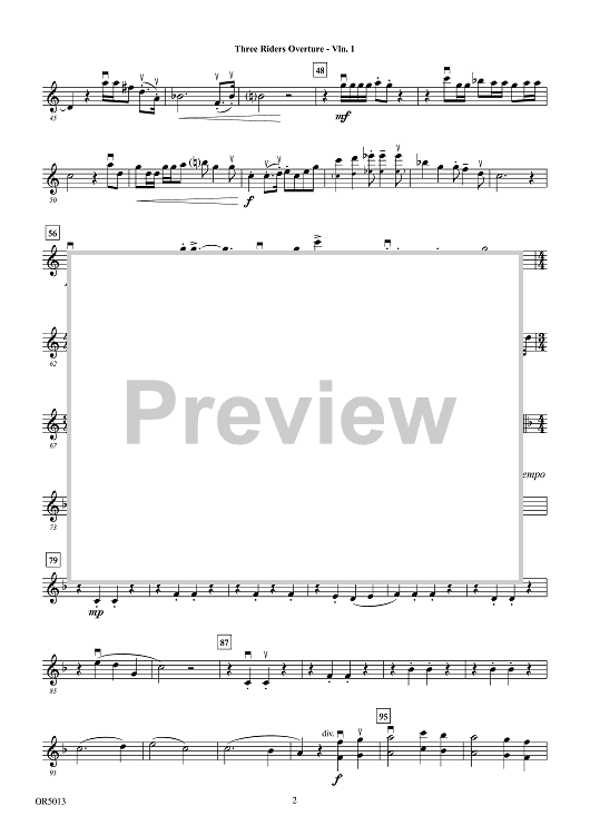 Digital Sheet Music for Three Riders Overture - Violin 1 by Carrie Lane Gruselle scored for Orchestra; id:506649