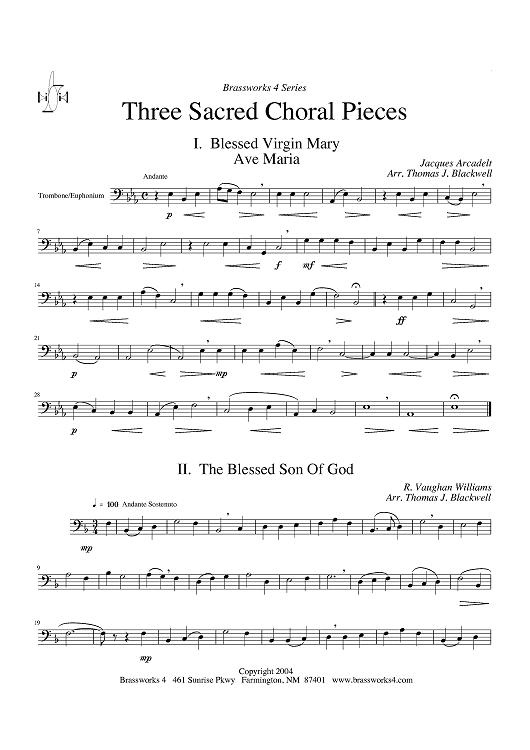 Digital Sheet Music for Three Sacred Choral Pieces - Trombone/Euphonium by Thomas J. Blackwell, Jacques Arcadelt scored for Brass Quartet; id:428256