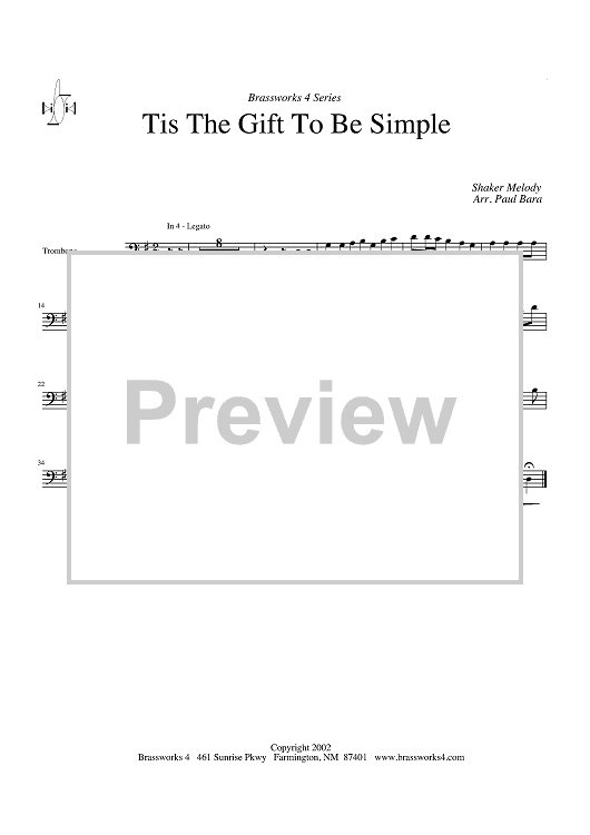 Digital Sheet Music for Tis the Gift to be Simple - Trombone by Paul Bara, Shaker Melody scored for Brass Quartet; id:316930