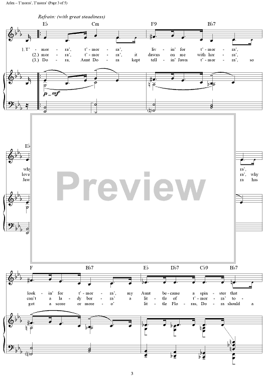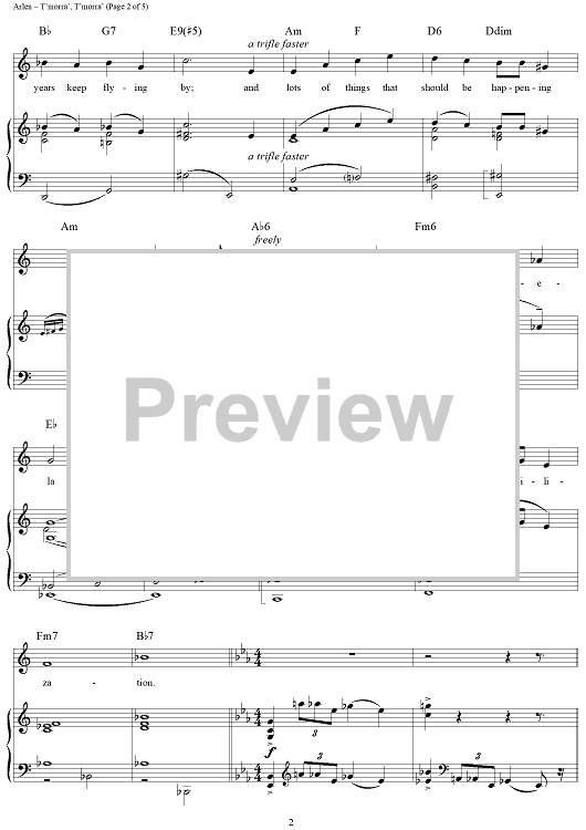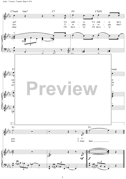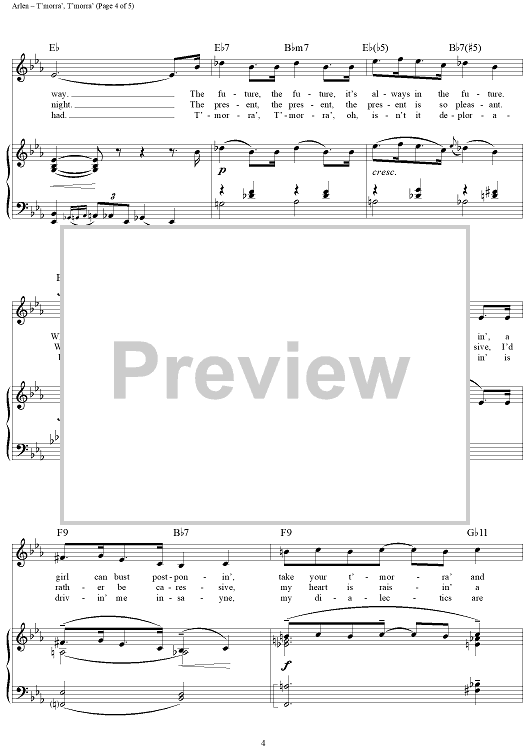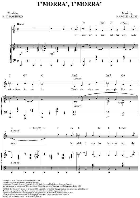 Digital Sheet Music for T'morra', T'morra' by Harold Arlen, E.Y. "Yip" Harburg scored for Piano/Vocal/Chords; id:355925
