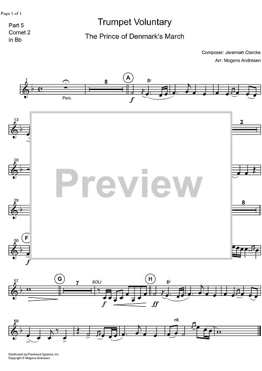 Digital Sheet Music for Trumpet Voluntary - B-flat Cornet 2 by Jeremiah Clarke, Mogens Andresen scored for Brass Ensemble; id:324939