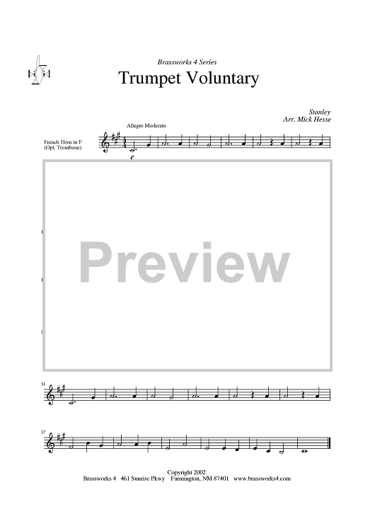 Digital Sheet Music for Trumpet Voluntary - Horn in F by John Stanley, Mick Hesse scored for Brass Quartet; id:316792