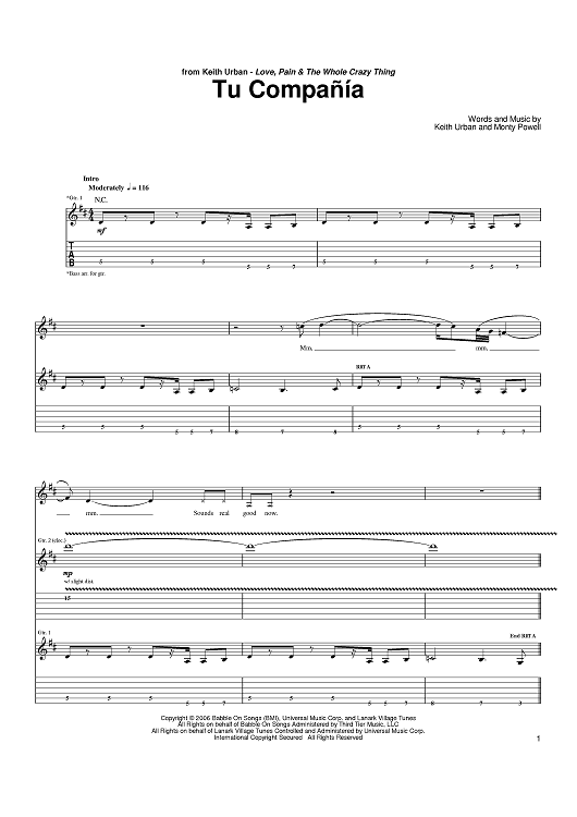 Digital Sheet Music for Tu Compania by Monty Powell, Keith Urban scored for Guitar Tab; id:399385