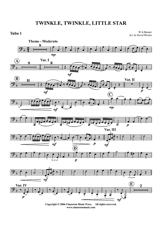 Digital Sheet Music for Twinkle, Twinkle, Little Star - Tuba 1 by Wolfgang Amadeus Mozart, David Werden scored for Tuba Quartet; id:358362