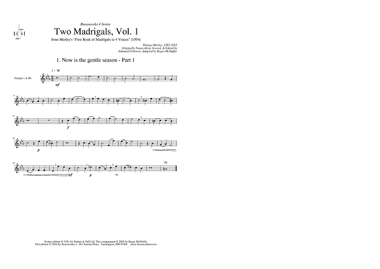 Digital Sheet Music for Two Madrigals, Vol. 1 - from Morley's "First Book of Madrigals to 4 Voices" (1594) - Trumpet 1 in Bb by Thomas Morley, Roger McDuffie scored for Brass Quartet; id:429179