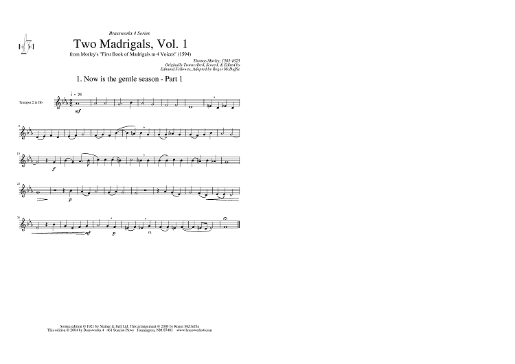 Digital Sheet Music for Two Madrigals, Vol. 1 - from Morley's "First Book of Madrigals to 4 Voices" (1594) - Trumpet 2 in Bb by Thomas Morley, Roger McDuffie scored for Brass Quartet; id:429180