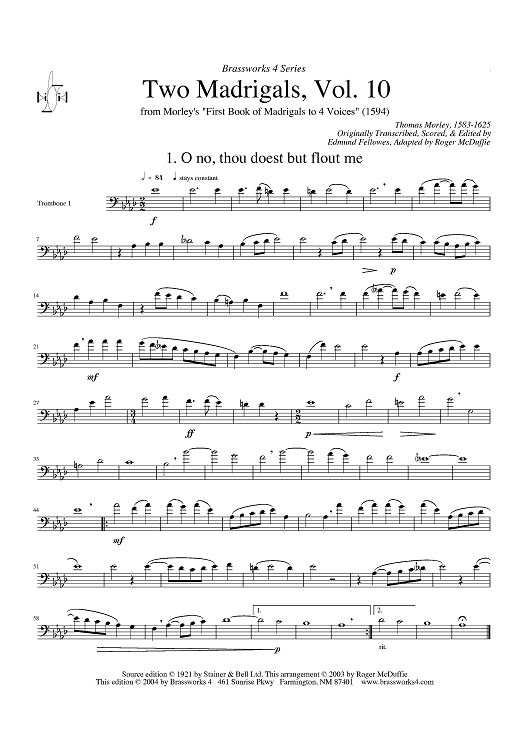 Digital Sheet Music for Two Madrigals, Vol. 10 - from Morley's "First Book of Madrigals to 4 Voices" (1594) - Trombone 1 (opt. F Horn) by Thomas Morley, Roger McDuffie scored for Brass Quartet; id:429235