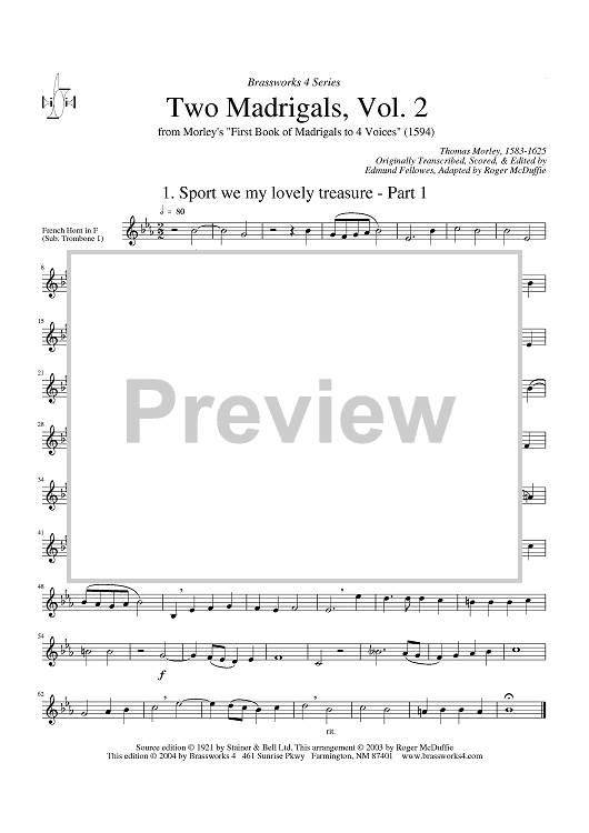 Digital Sheet Music for Two Madrigals, Vol. 2 - from Morley's "First Book of Madrigals to 4 Voices" (1594) - Trombone 1 (opt. F Horn) by Thomas Morley, Roger McDuffie scored for Brass Quartet; id:429187