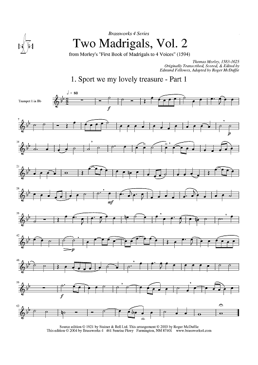 Digital Sheet Music for Two Madrigals, Vol. 2 - from Morley's "First Book of Madrigals to 4 Voices" (1594) - Trumpet 1 in Bb by Thomas Morley, Roger McDuffie scored for Brass Quartet; id:429185