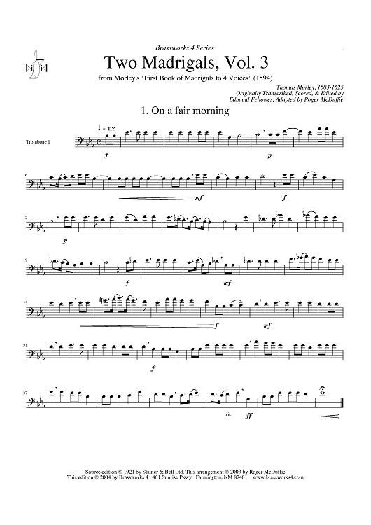 Digital Sheet Music for Two Madrigals, Vol. 3 - from Morley's "First Book of Madrigals to 4 Voices" (1594) - Trombone 1 (opt. F Horn) by Thomas Morley, Roger McDuffie scored for Brass Quartet; id:429193