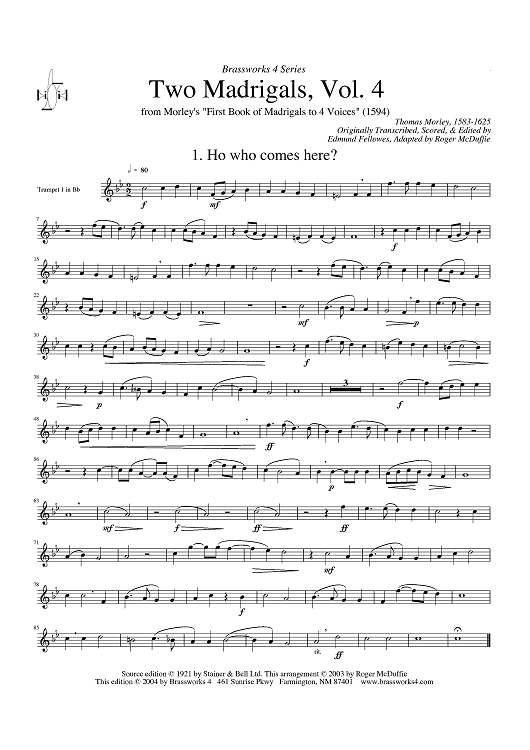 Digital Sheet Music for Two Madrigals, Vol. 4 - from Morley's "First Book of Madrigals to 4 Voices" (1594) - Trumpet 1 in Bb by Thomas Morley, Roger McDuffie scored for Brass Quartet; id:429197