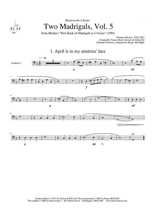 Digital Sheet Music for Two Madrigals, Vol. 5 - from Morley's "First Book of Madrigals to 4 Voices" (1594) - Trombone 2 by Thomas Morley, Roger McDuffie scored for Brass Quartet; id:429206