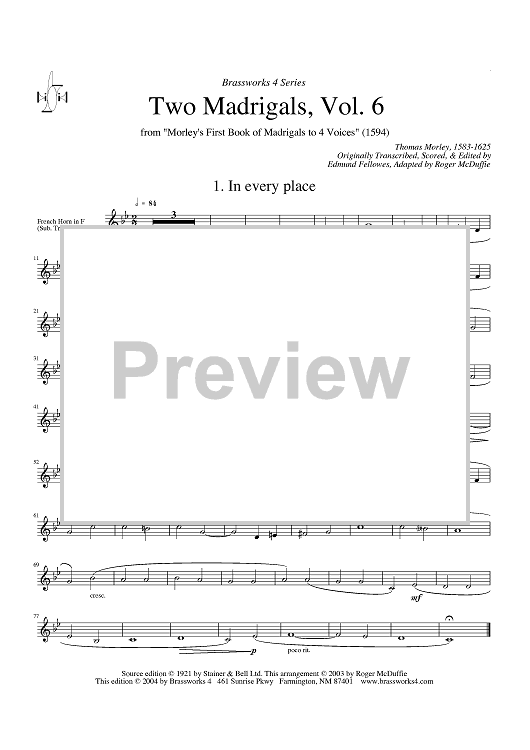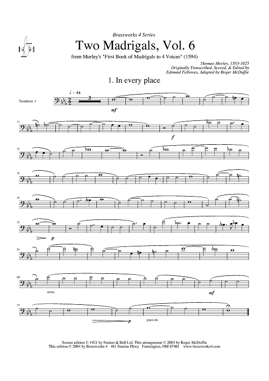 Digital Sheet Music for Two Madrigals, Vol. 6 - from Morley's "First Book of Madrigals to 4 Voices" (1594) - Trombone 1 (opt. F Horn) by Thomas Morley, Roger McDuffie scored for Brass Quartet; id:429211
