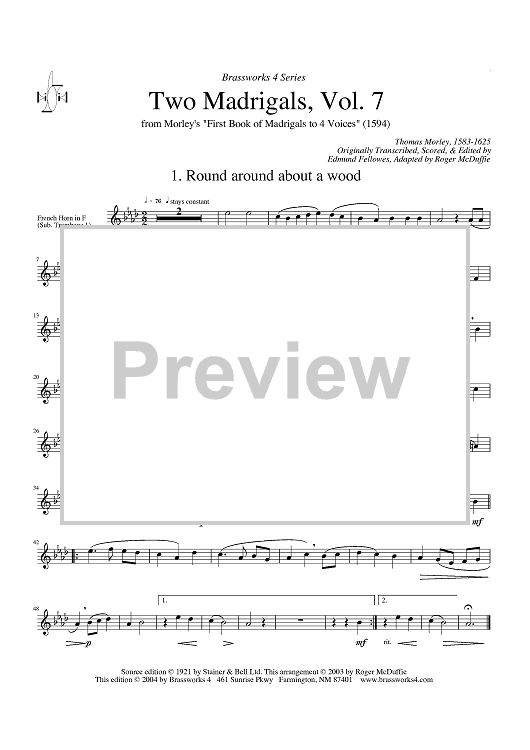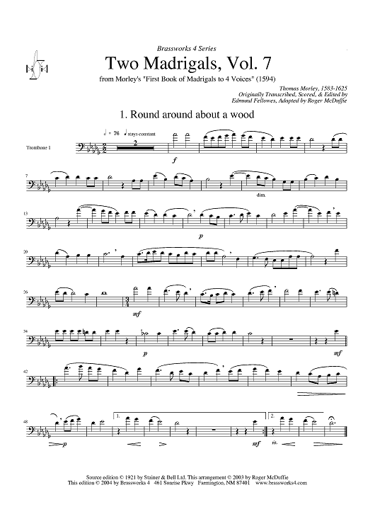 Digital Sheet Music for Two Madrigals, Vol. 7 - from Morley's "First Book of Madrigals to 4 Voices" (1594) - Trombone 1 (opt. F Horn) by Thomas Morley, Roger McDuffie scored for Brass Quartet; id:429217