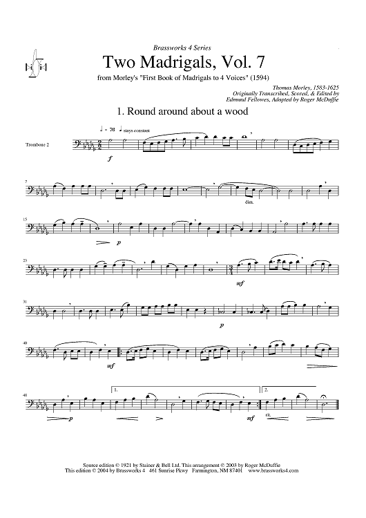 Digital Sheet Music for Two Madrigals, Vol. 7 - from Morley's "First Book of Madrigals to 4 Voices" (1594) - Trombone 2 by Thomas Morley, Roger McDuffie scored for Brass Quartet; id:429218