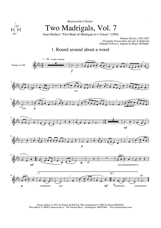 Digital Sheet Music for Two Madrigals, Vol. 7 - from Morley's "First Book of Madrigals to 4 Voices" (1594) - Trumpet 2 in Bb by Thomas Morley, Roger McDuffie scored for Brass Quartet; id:429216