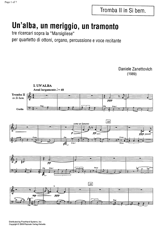 Digital Sheet Music for Un'alba, un meriggio, un tramento - B-flat Trumpet 2 by Daniele Zanettovich scored for Brass Quartet/Organ/Percussion/Narrator; id:345125