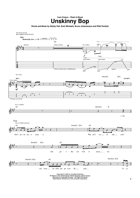 Digital Sheet Music for Unskinny Bop by Poison, Bobby Dall, Rikki Rockett, C. C. DeVille, Brett Michaels scored for Guitar Tab; id:394072