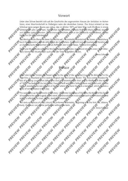 With Unter dem Schnee Anno Schreier presents a work for flute, oboe, viola d’amore, violoncello and harpsichord, which refers to a historical event in the High Fens. The starting point is the story of the so-called Cross of the Betrothed, which commemorates the fate of a young couple from Jalhay: François Reiff and Marie Solheid died in a snowstorm on their way to Xhoffraix in the winter of 1871. Months later, their bodies were found; a wooden cross was erected at the site, which remains a place of remembrance to this day. The work takes up the elements of this story – the wintry landscape of the moorland near the German-Belgian border, the threat of the forces of nature and the silent tragedy of the events. It sees itself as a musical approach to the historical event and as a reflection on love, nature, death and memory. The poems by Alexander Jansen are an integral part of the concept. Texts and pieces of music are to be performed alternately, starting with the first text. Alternatively, the music pieces can also be played without the texts. Under the Snow is aimed at chamber ensembles who want to create literary-musical programs, as well as organizers who want to present historical material in a reflective concert format. The special instrumentation opens up differentiated tonal possibilities between winds, strings and harpsichord.