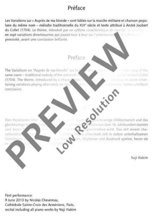 Naji Hakim (*1955), French composer of Lebanese descent, not only writes pieces for his principal instrument, the organ; even his piano works are characterized by many different sources, his major source of inspiration often being folk songs such as 'Auprès de ma blonde' whose melody dates back to the 16th century. The theme, which is introduced with a typical march rhythm, is developed in seven entertaining variations. One of the most popular French folk songs, interpreted by Elvis Presley and Doris Day among others, still is sung and played today. The present arrangement is an effective addition to the repertoire of every pianist.