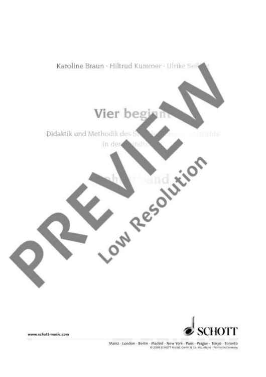 "Vier Beginnt" was developed for string class teaching of pupils at primary school age but can also be used for individual lessons. Thanks to numerous new songs and instrumental pieces with pupil-oriented texts, a balance is created between the demands of the deep and high strings which allows a homogeneous learning tempo within the group. The appendix with performance literature for the beginning orchestra provides varied possibilities for concert performances at music and primary schools.