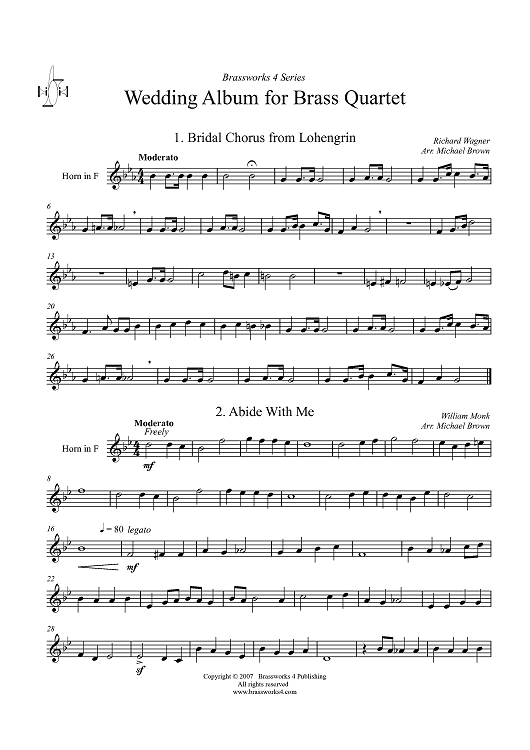 Digital Sheet Music for Wedding Album for Brass Quartet - Horn in F by George Frideric Handel, Felix Mendelssohn, Richard Wagner, Jeremiah Clarke, Johann Pachelbel, Georg Philipp Telemann, William Henry Monk, Michael Brown scored for Brass Quartet; id:364211