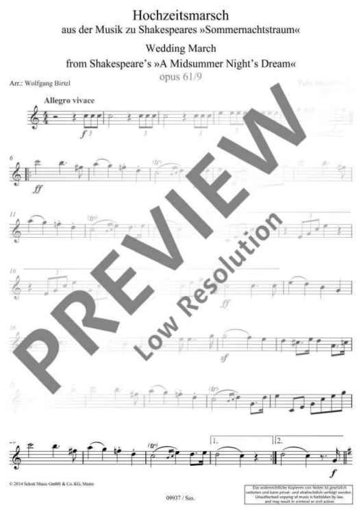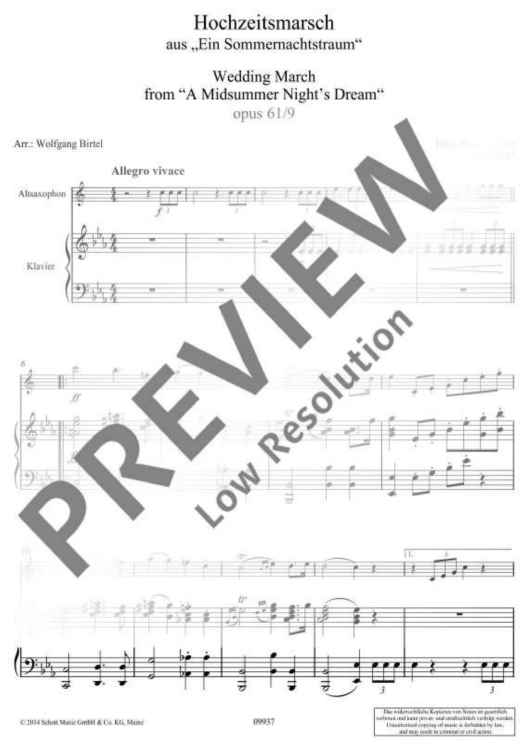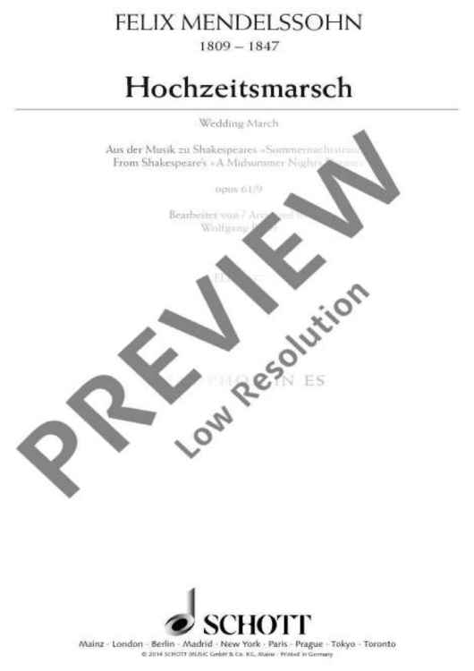 A wedding without a famous wedding march – unimaginable! Wagner's 'Bridal Chorus' from 'Lohengrin' and Mendelssohn's 'Wedding March' from the incidental music of 'A Midsummer Night's Dream' vie for the favour of bridal couples and wedding parties. If, however, the music shall be festive, Mendelssohn's background music for the wedding ceremony remains first choice. In order that the march cannot only be performed with the organ but also with a melodic instrument with piano (or organ) accompaniment, the present editions provide easy-to-play arrangements.