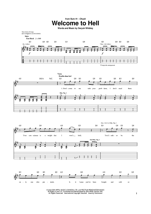 Digital Sheet Music for Welcome To Hell by Sum 41, Deryck Whibley scored for Guitar Tab; id:383328