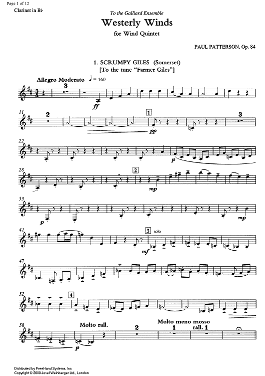 Digital Sheet Music for Westerly Winds Op.84 - Clarinet in B-flat by Paul Patterson scored for Wind Quintet; id:333600
