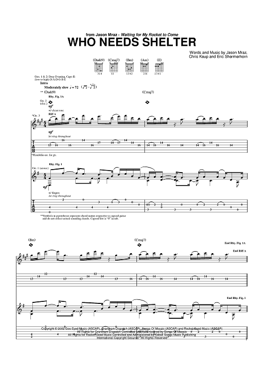 Digital Sheet Music for Who Needs Shelter by Chris Keup, Eric Shermerhorn, Jason Mraz scored for Guitar Tab; id:384680
