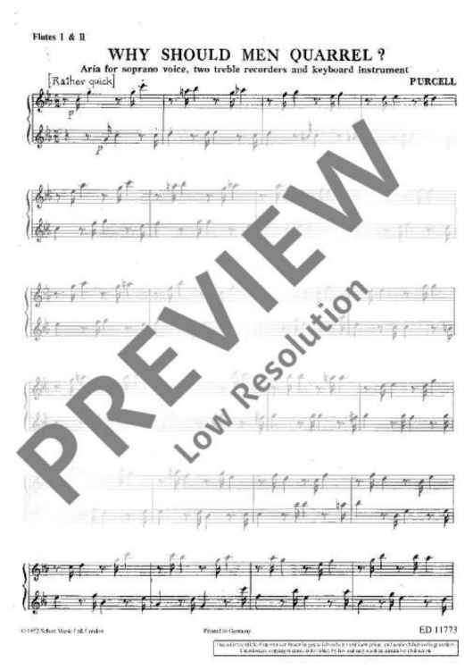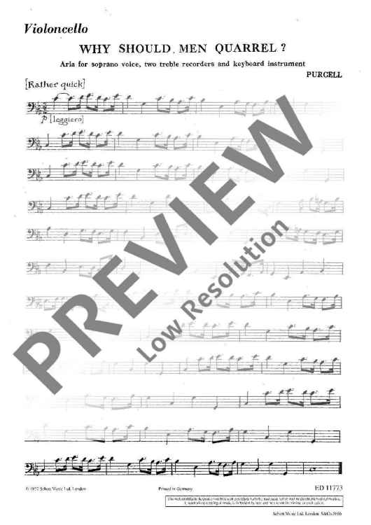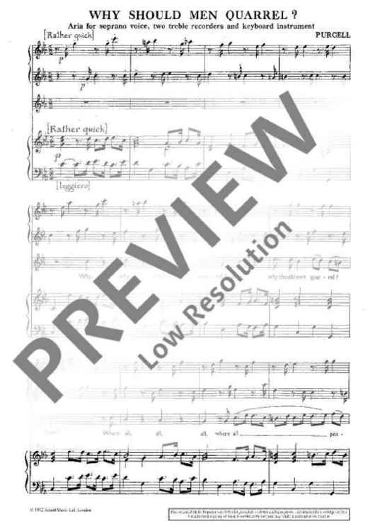Digital Sheet Music for Why Should Men Quarrel? by Henry Purcell scored for Soprano, 2 Treble Recorders And Piano; Cello Ad Libitum; id:476740