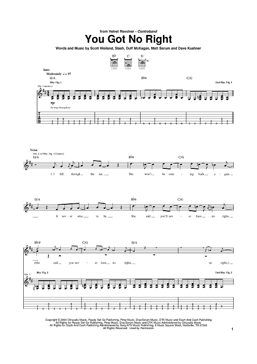 Digital Sheet Music for You Got No Right by Scott Weiland, Slash, Dave Kushner, Duff McKagan, Matt Sorum, Velvet Revolver scored for Guitar Tab; id:383513