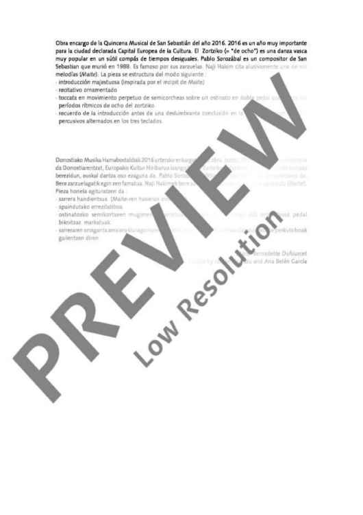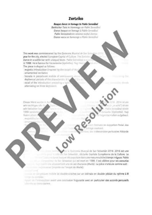 This commissioned work is a tribute to a famous son of the city of San Sebastian: the composer Pablo Sorozábal (1897-1988). As is typical of the zortziko ('in eight'), the popular Basque dance, the piece is written in a subtle metre with uneven beats.