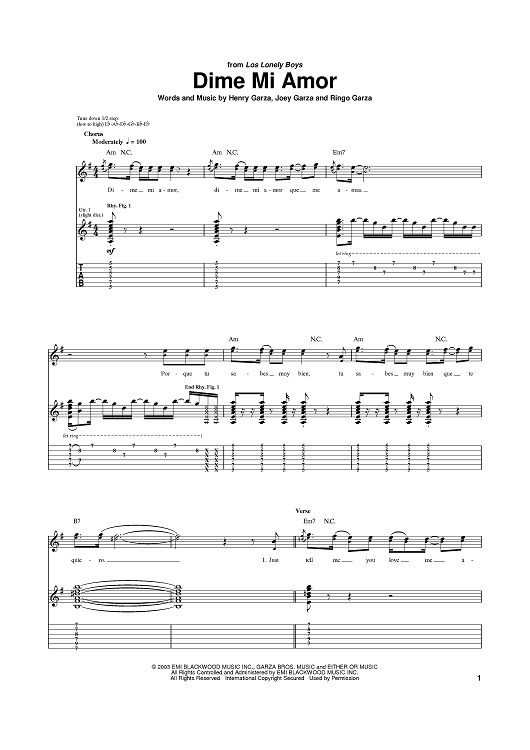 Digital Sheet Music for Dime Mi Amor by Henry Garza, Joey Garza, Ringo Garza, Los Lonely Boys scored for Guitar Tab; id:380499