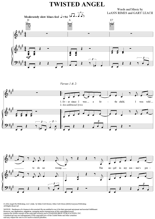 Digital Sheet Music for Twisted Angel by LeAnn Rimes, Gary Leach scored for Piano/Vocal/Chords; id:294110