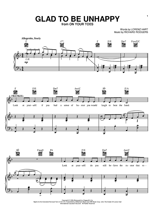 Digital Sheet Music for Glad To Be Unhappy by Frank Sinatra, The Mamas and The Papas, Richard Rodgers, Lorenz Hart, Lena Horne scored for Piano/Vocal/Chords; id:397613
