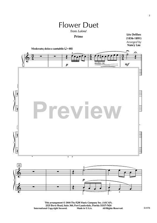 his beautiful duet arrangement of Flower Duet from the opera, Lakmé by Delibes, is presented here for the intermediate-level duet player. This is the perfect piece to set an elegant mood at recitals, weddings, or other events. This arrangement gives equal highlight to the primo and secondo parts - students will love performing this piece.