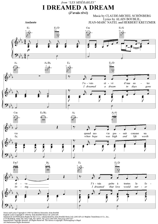 Digital Sheet Music for I Dreamed A Dream (J'avais Rêvé) by Claude-Michel Schonberg, Herbert Kretzmer, Alain Boublil, Jean-Marc Natel scored for Piano/Vocal/Chords; id:403237
