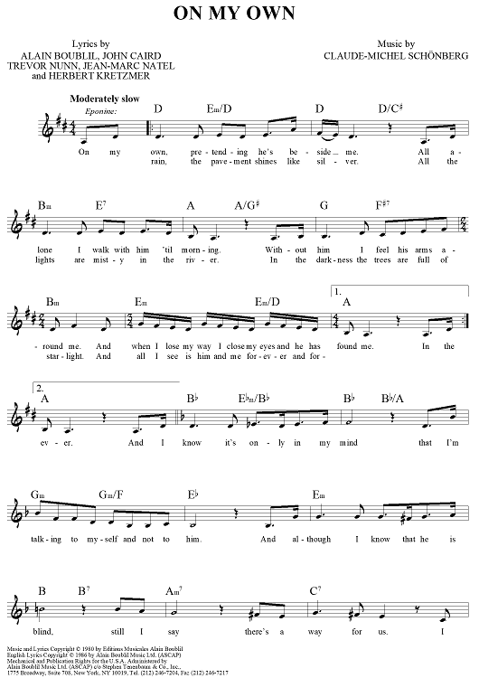 Digital Sheet Music for On My Own by John Caird, Trevor Nunn, Claude-Michel Schonberg, Herbert Kretzmer, Alain Boublil, Jean-Marc Natel scored for Lead Sheet; id:451947