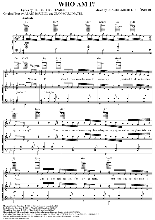 Digital Sheet Music for Who Am I? by Claude-Michel Schonberg, Herbert Kretzmer, Alain Boublil, Jean-Marc Natel scored for Piano/Vocal/Chords; id:366047