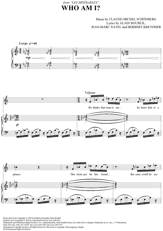 Digital Sheet Music for Who Am I? by Claude-Michel Schonberg, Herbert Kretzmer, Alain Boublil, Jean-Marc Natel scored for Piano/Vocal; id:403173
