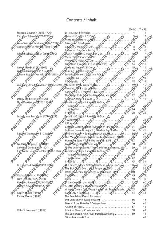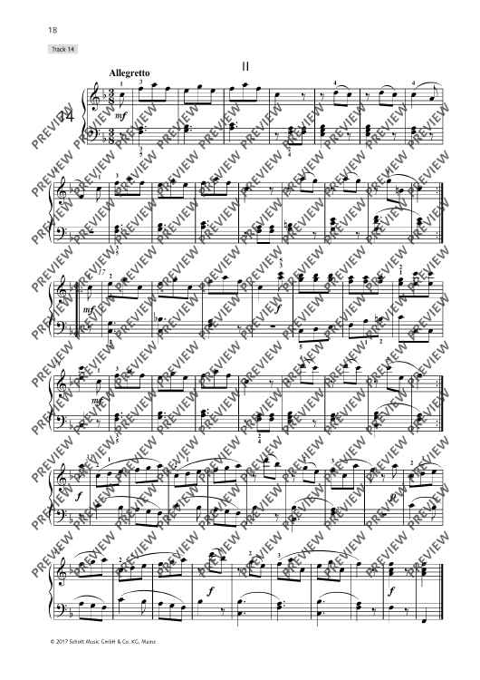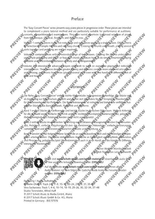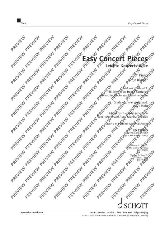 The Easy Concert Pieces series presents easy piano pieces for beginners in progressive order. Three volumes have already been published. These pieces are intended to complement a piano tutorial method and are particularly suitable for performance at auditions, concerts, competitions and examinations. They offer varied repertoire in a broad selection of pieces from the Baroque, Classical, Romantic and Modern eras. Volume 1 (ED 22547) is meant for beginners. The pieces span a single octave and stay within five-finger positions. Other criteria for the selection of the pieces are simple rhythms and very easy chord playing. Crossing the thumb under, polyphony and pedal are not required yet.Volume 2 (ED 22548) extends the range to two octaves. Hand turns (crossing the thumb under), pedal, simple polyphony and three- or four-part chords all feature in Volume 2, as do simple ornaments, playing cantabile and differentiating between melody and accompaniment. Volume 3 (ED 22549) is aimed at advanced players who wish to refine their expression and personal interpretation. The pieces demand a great deal of dexterity, a high sense of rhythm, articulation and phrasing, polyphonic playing (polyphony even in one hand) and tonal differentiation of the piano setting.