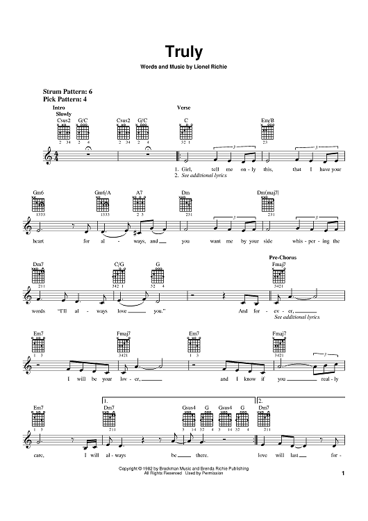 Digital Sheet Music for Truly by Lionel Richie scored for Lead Sheet with Guitar Grids; id:383100