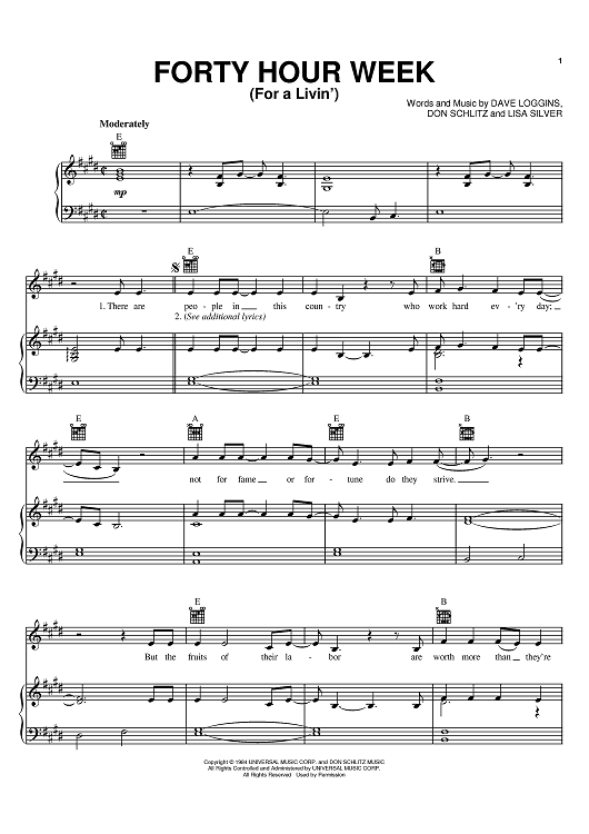 Digital Sheet Music for Forty Hour Week (For A Livin') by Don Schlitz, Dave Loggins, Alabama, Lisa Silver scored for Piano/Vocal/Chords; id:389755