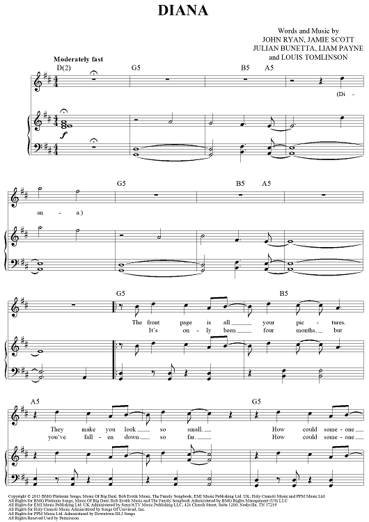 Digital Sheet Music for Diana by One Direction, Liam Payne, Louis Tomlinson, Jamie Scott, Julian Bunetta, John Ryan scored for Piano/Vocal/Chords; id:444904
