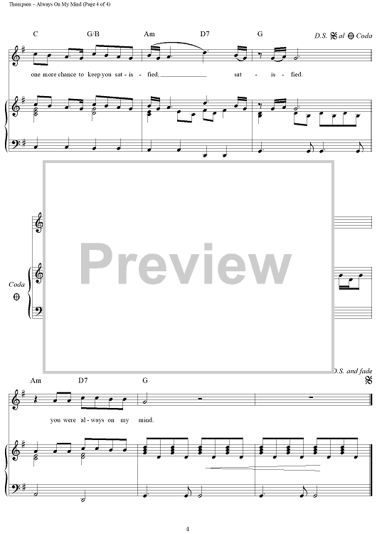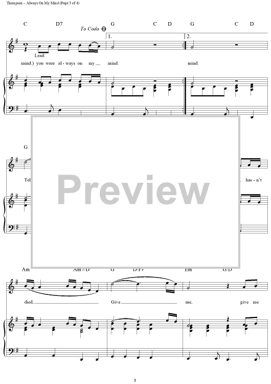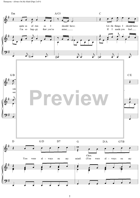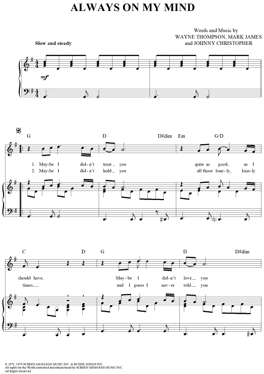 Digital Sheet Music for Always On My Mind by Wayne Thompson, Mark James, Johnny Christopher, Willie Nelson scored for Piano/Vocal/Chords; id:120797