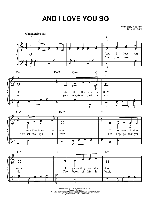 Digital Sheet Music for And I Love You So by Don McLean scored for Easy Piano; id:390452